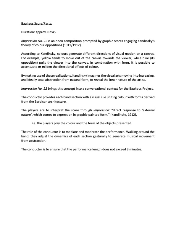 Kandinsky’s theory informed the graphic scores, in which we applied different arrangements of colour and form to invoke an emotional response to the Barbican’s key architectural features. We applied Miro’s automatic technique to our re-composition and arrangement of the recorded material, allowing ourselves to alter the piece without our usual concerns for balanced structure and inclusion of popular music tropes.